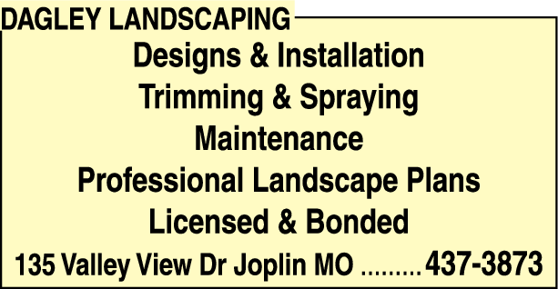 Names and Numbers Verified Landscapers Landscape MaintenanceDagley Landscaping from Joplin, MO. Company specialized in: Landscapers. Please call us for more information - (417) 437-3873