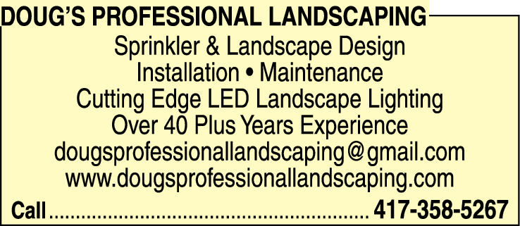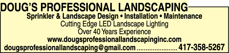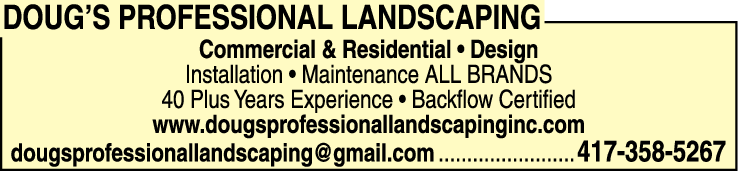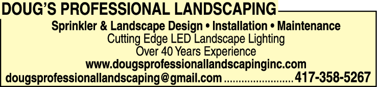 Names and Numbers Verified Backflow Prevention Devices Irrigation Systems & Repair Landscapers Landscape LightingDoug's Professional Landscaping, locally owned, family operated serving Carthage and the surrounding area providing top quality products and services at fair prices. Residential & Commercial landscaping and more. Call Doug today!