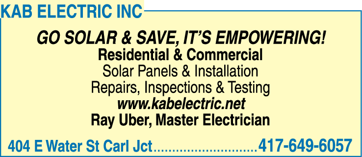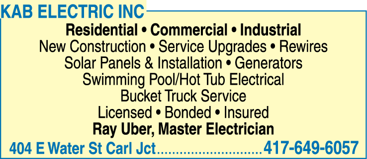 Names and Numbers Verified Electrician Electrical Repair & Maintenance Generators Generators - RepairingKAB Electric, founded in 2003 and based in Carl Jundion, MO, serves a 60-mile radius around Joplin, including parts of Southwest Missouri, Southeast Kansas, Northeast Oklahoma, and Northwest Arkansas. The company prides itself on being a licensed, bonded, and insured electrical …