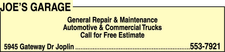 Names and Numbers Verified Truck Repair & ServiceJoe's Garage is a trusted establishment providing comprehensive repair and maintenance services for both automotive and commercial trucks. Located at 5945 Gateway Dr in Joplin, our experienced team of technicians is equipped with the skills and knowledge to handle a wide range o…