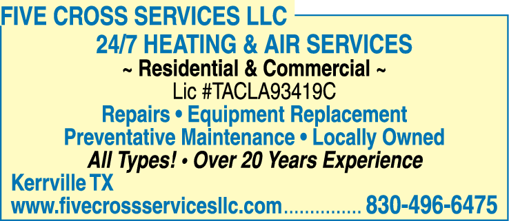 Names and Numbers Verified Air Conditioning Contractors Air Conditioning Equipment & Systems - Repairing Heat Pumps Heating ContractorsAre you searching for an honest HVAC contractor who serves Bandera, Comfort, Fredericksburg, Hunt, Ingram, Kerrville or the surrounding areas in Texas? Five Cross Services LLC offers big company quality with small company value. We’re the heating and air conditioning expert you …