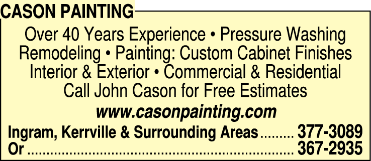 Names and Numbers Verified General Contractors Contractors - Painting Home Improvement Services Painters• Allow Cason Painting to brighten your home with a variety of high quality, high value painting services. Our expertise with interior & exterior projects has allowed us to perfect our passion and precision, while completing the task in a timely manner. Our expert team will trim…