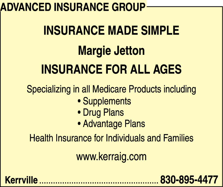 Names and Numbers Verified Insurance Agency Health Insurance Medicare Supplement Insurance Medicare Supplement/Advantage & Long Term Care InsuranceAdvanced Insurance Group is a renowned insurance agency, located in Kerrville, Texas. Our goal is to make the insurance process simple and hassle-free for our valued clients. Led by our experienced and knowledgeable agent, Kathy LeStourgeon, we specialize in providing a range of…