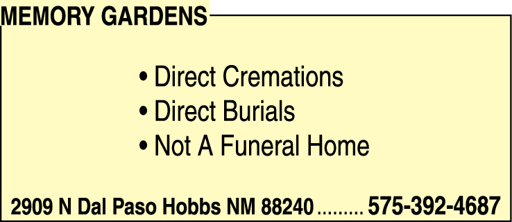 Names and Numbers Verified Cemeteries & Memorial Parks Cremation Services Funeral Plans - Pre-Arranged Metal ArtMemory Gardens, nestled in the heart of Hobbs, NM, is a serene final resting place that exudes tranquility and reverence. As you wander through the well-maintained grounds, you'll be greeted by a sea of gravestones, each telling a unique story of lives once lived. The gentle rus…