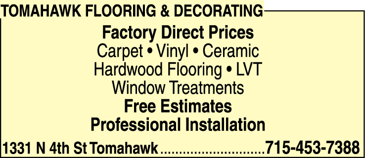 Names and Numbers Verified Blinds - Mini, Vertical, Etc Carpet Dealers Floor Materials Dealers Interior DesignerTomahawk Free Flooring & Decorating, owned by Michael Kaiser, is a professional installation company located at 1331 N. 4th St. in Tomahawk. We specialize in a wide range of flooring and window treatment services, including carpet, vinyl, luxury vinyl tile (LVT), ceramic, and ha…