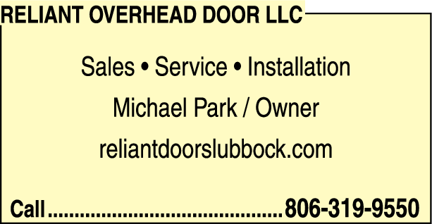 Names and Numbers Verified Garage Doors & Openers Garage Doors & Openers - Repair & InstallationWelcome to Reliant Overhead Door LLC., of Lubbock, Texas - Your Garage Door Specialists. With a focus on honesty, integrity, and quality workmanship, we're here to help with all of your residential and commercial garage door needs. We're firefighter owned & operated, and have be…