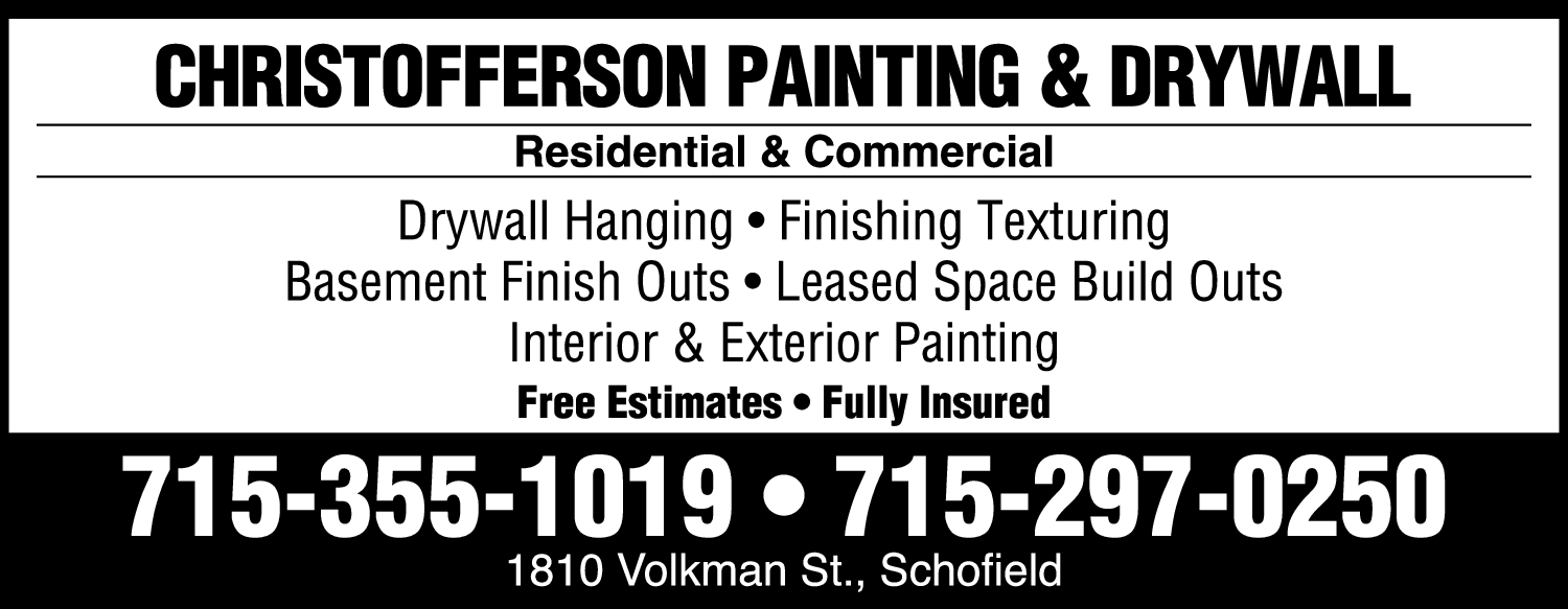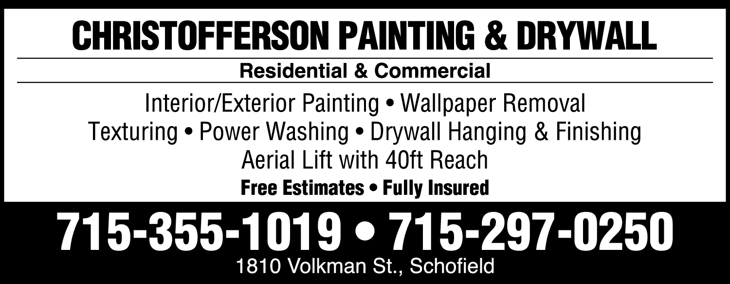 Names and Numbers Verified Drywall Contractors Painters Contractors - Painting Painting - Custom FinishesChristofferson Painting & Drywall is a reputable business specializing in residential and commercial painting and drywall services. With a team of skilled professionals, we offer top-quality interior and exterior painting for both residential and commercial properties. Our servi…