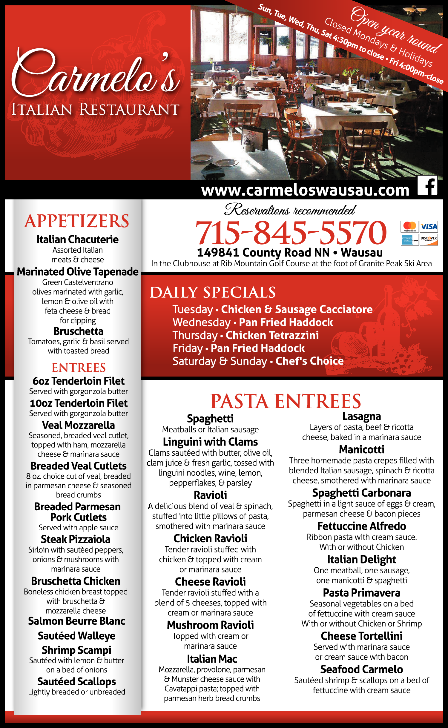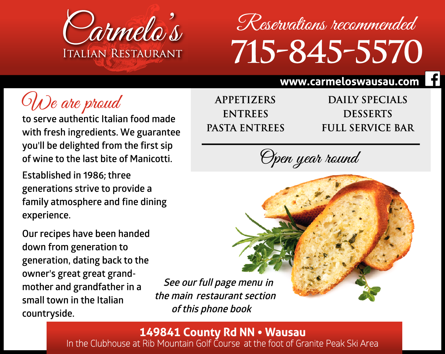 Names and Numbers Verified Restaurants Restaurants - Italianthe establishment of Carmelo's in 1986. Located in the Clubhouse at Rib Mountain Golf Course, at the foot of Granite Peak Ski Area in Wausau, our Italian restaurant offers a unique dining experience for both locals and visitors alike. Reservations are highly recommended to ensur…