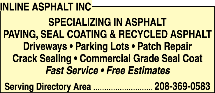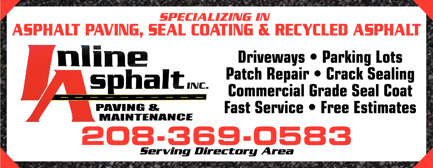 Names and Numbers Verified Paving Contractors Seal Coating Directories Asphalt & Paving Contractorslnline Asphalt INC, Is locally owned and operated and Specializes in Asphalt. Fast Service and Free Estimates. Call us today at 208 369-0583