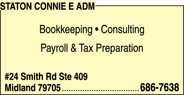 Names and Numbers Verified Accounting Services Bookkeeping Service Tax Return PreparationStaton Connie E ADM is a reputable business located at #24 Smith Rd, Ste 409 in Midland, zip code 79705. We specialize in providing professional payroll and tax preparation services to individuals and businesses. With our experienced team, we ensure accurate and timely payroll p…