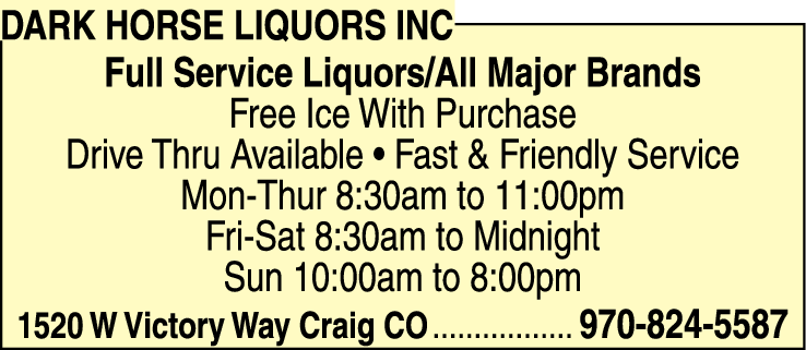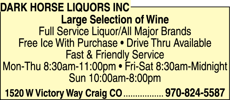 Names and Numbers Verified Beer, Ale & Wine - Retail Liquor Stores Wines - RetailDark Horse Liquors Inc is a premier liquor store located at 1520 W Victory Way in Craig. We pride ourselves on offering a large selection of wines and full-service liquors, carrying all major brands that our customers love. At Dark Horse Liquors, we believe in providing exce…