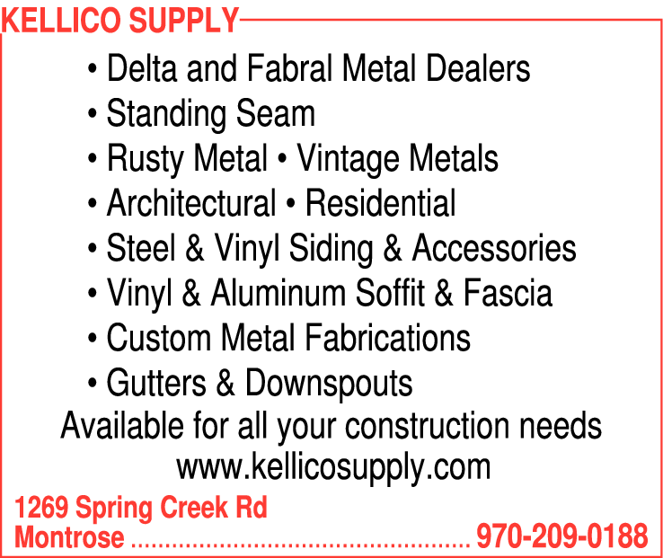 Names and Numbers Verified Building Materials Construction Equipment & Supplies Doors - Custom Roofing MaterialsWelcome to Kellico Supply. We offer a wide variety of siding and roofing options, including custom metal brake work, doors, and windows ~ a one-stop shop for your next home renovation or new construction project. WE NOW SELL SHEDS! CALL TODAY FOR A QUOTE (970)209-0188