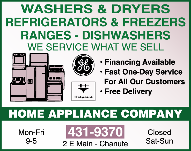 Names and Numbers Verified Appliances - Household - Major - Dealers Appliances Service & Repair Washing Machines & Dryers - DealersFlynn Appliance Center Llc from Chanute, KS. Company specialized in: Appliances - Household - Major - Dealers. Please call us for more information - (620) 365-2538