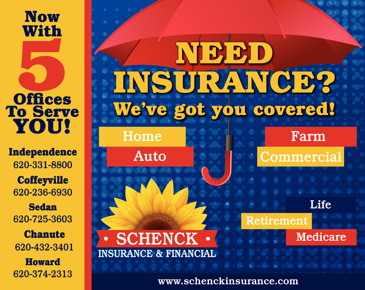 Names and Numbers Verified Insurance Agency Annuities Insurance - Cancer Insurance - DisabilitySchenck Insurance & Financial is a trusted insurance agency that offers a wide range of coverage options to protect individuals and businesses in the Southeast Kansas region. With our five conveniently located offices, we are committed to serving the insurance needs of our clien…