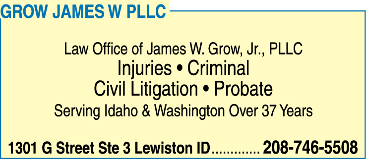 Names and Numbers Verified Attorneys Criminal Attorneys Lawyers CriminalGROW JAMES W PLLC Law Office of James W. Grow, Jr., PLLC is a well-established legal firm operating in Idaho and Washington for over 30 years. With extensive experience in various legal areas, including injuries, criminal defense, civil litigation, and probate, our team is dedic…