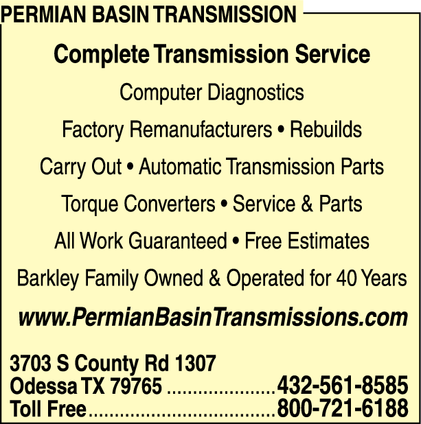 Names and Numbers Verified Transmission Repair Transmissions Transmissions - Automobile Transmissions - Automotive - PartsWELCOME TO PERMIAN BASIN TRANSMISSION A transmission shop serving residents of Odessa, Midland, Andrews & Abilene, Texas. We are your full-service transmission experts in Odessa, TX! If it shifts in a car or truck you can depend on the fact that we have worked on it, know all a…