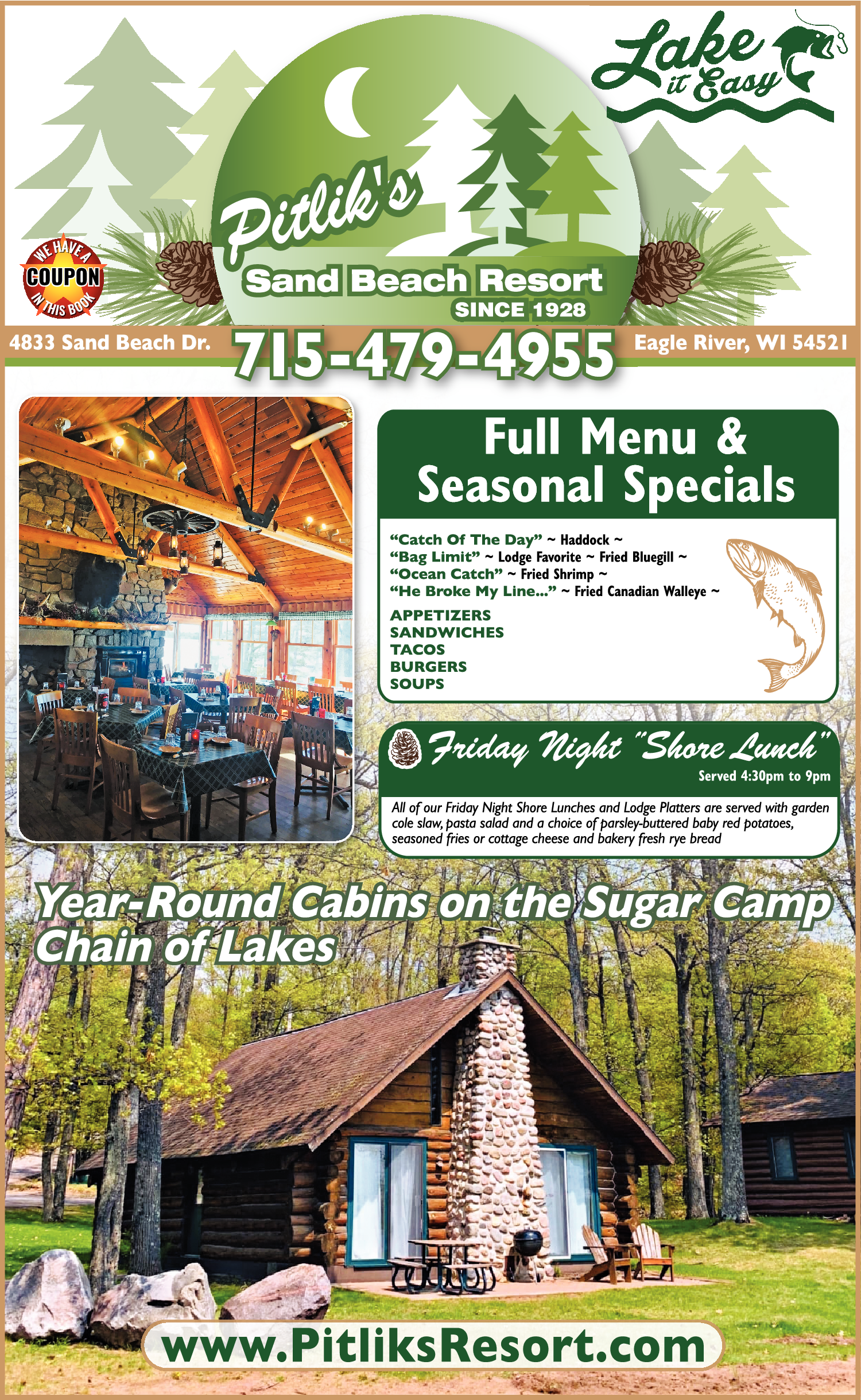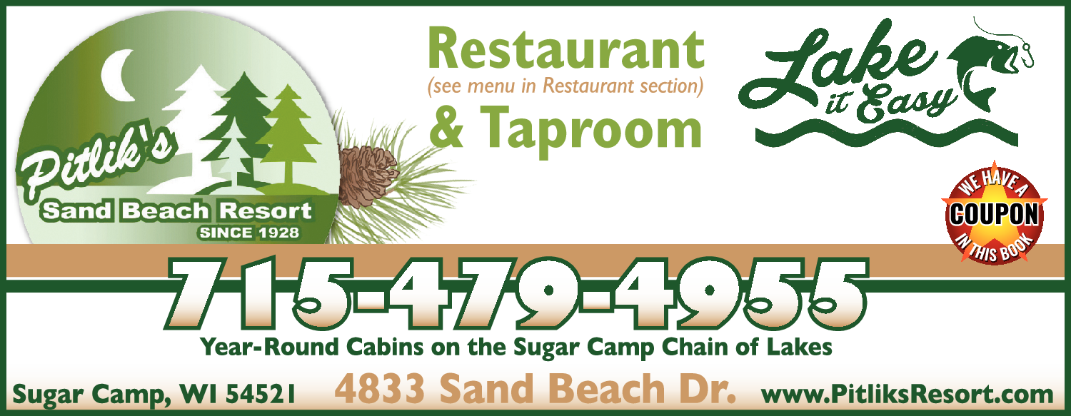 Names and Numbers Verified Bars Clubs Cocktail Lounges Hotels, Motels & Other AccommodationsEnjoy family fun and Northwoods adventure every season of the year at Pitlik's Sand Beach Resort in Eagle River, WI! Pet-friendly Pitlik’s Sand Beach Resort features picturesque wilderness relaxation, peaceful cabin lodging, restaurant at the main lodge and activities, including…