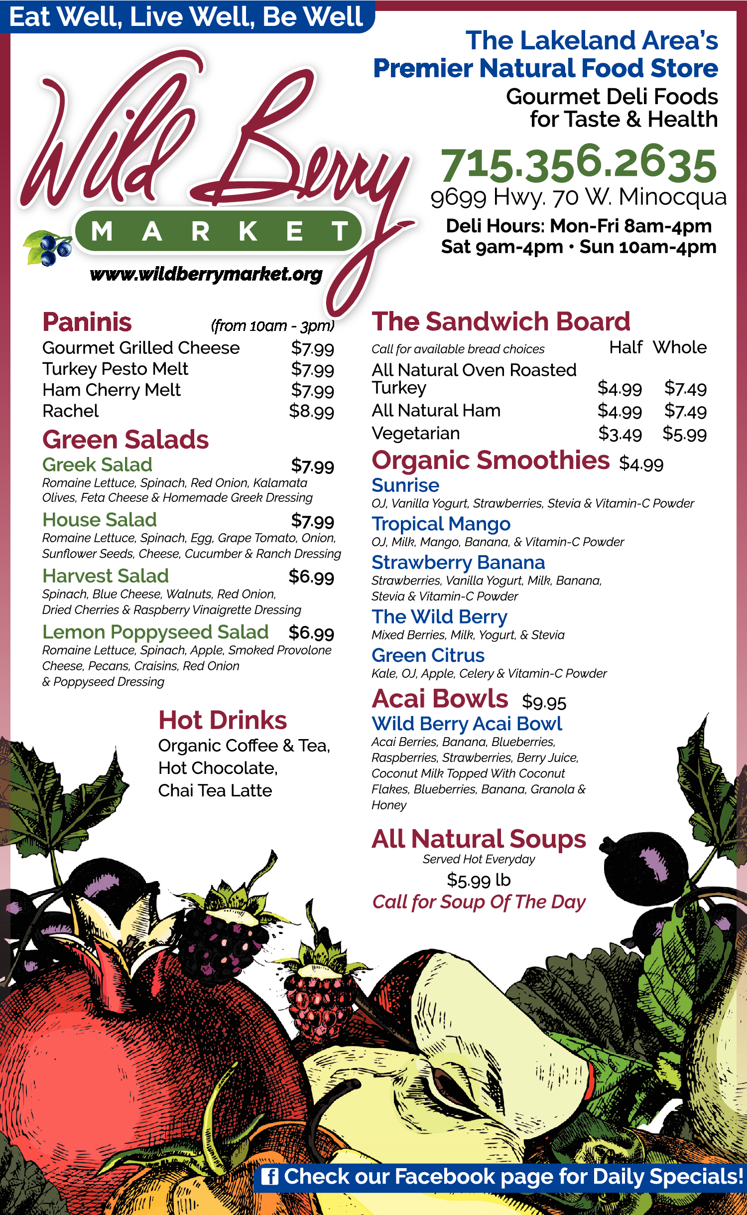 Names and Numbers Verified Health & Diet Food Products RestaurantsVisit Wild Berry Market, the premier natural food store in the Minocqua area, for all your organic food and health needs. We carry organic produce, natural & organic grocery, supplements, and more. Wild Berry Market has been providing quality organic food and on-the-go deli i…