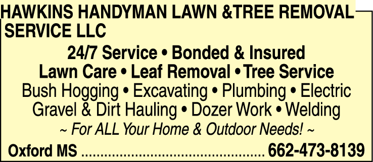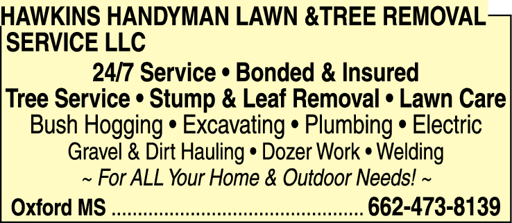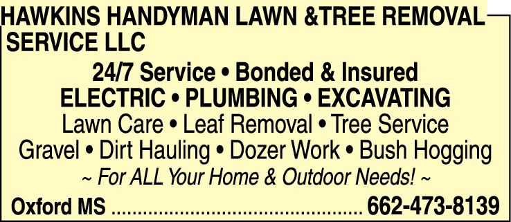 Names and Numbers Verified Backhoe & Excavation Contractors Bush Hogging Handyman Services Lawn Care & MaintenanceHawkins Handyman Lawn & Tree Removal Service LLC from Oxford, MS. Company specialized in: Backhoe & Excavation Contractors. Call us for more - (662) 473-8139