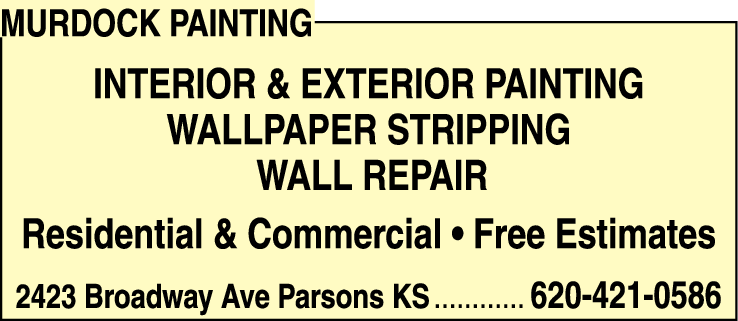 Names and Numbers Verified Contractors - Painting Painters Decks - Staining & SealingMurdock Painting is a professional painting and wallpaper stripping company located in Parsons, Kansas. We specialize in both interior and exterior painting services for residential and commercial properties. Our team of skilled painters is equipped to handle a wide range of pro…