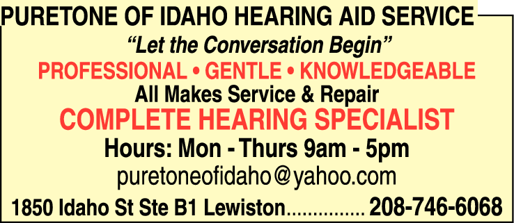 Names and Numbers Verified Hearing Aids & Assistive Devices Hearing Aids - Parts & Repairing Hearing Testing Doula ServicesPureTone of Idaho Hearing Aid Service is your Complete Hearing Specialist- Our Professional Knowledgeable Staff is here to help service and repair all makes and models of Hearing Aids & Assistive Devices -From hearing tests to fitting we are here to help.