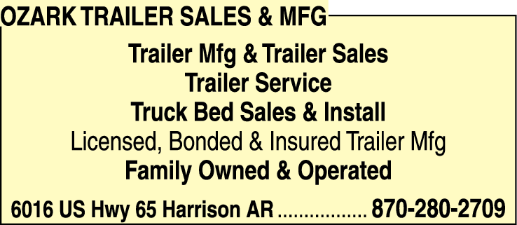 Names and Numbers Verified Trailer Hitches Trailer Parts - New Trailers - Dealers Trailers - ManufacturersOzark Trailer Sales & MFG is a family-owned and operated business located at 6016 US Hwy 65 in Harrison, AR. We specialize in the manufacturing and sales of trailers, offering a wide range of options to cater to the diverse needs of our customers. Whether you're in need of a tra…