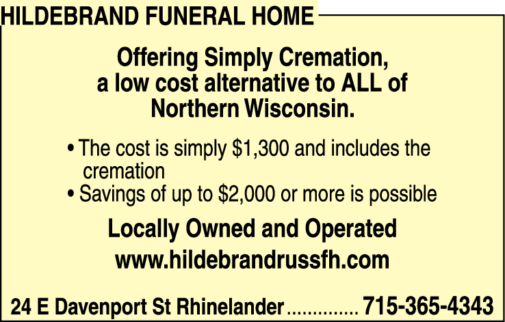 Names and Numbers Verified Cremation Services Funeral Homes HomesHildebrand-Russ Funeral Home located in Rhinelander, WI is proud to provide services for all of Northern Wisconsin. We offer full, all-inclusive services including memorial services, cremation, and pre-planned funerals. We are also proud to offer green caskets and green services.