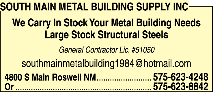 Names and Numbers Verified Metal Buildings General Contractors Building Contractors Metal DistributorsSouth Main Metal Building Supply Inc is a reputable and established business located in Roswell, NM. We specialize in providing high-quality metal building supplies to meet all your construction needs. With a large stock of structural steels and a commitment to customer satisfac…