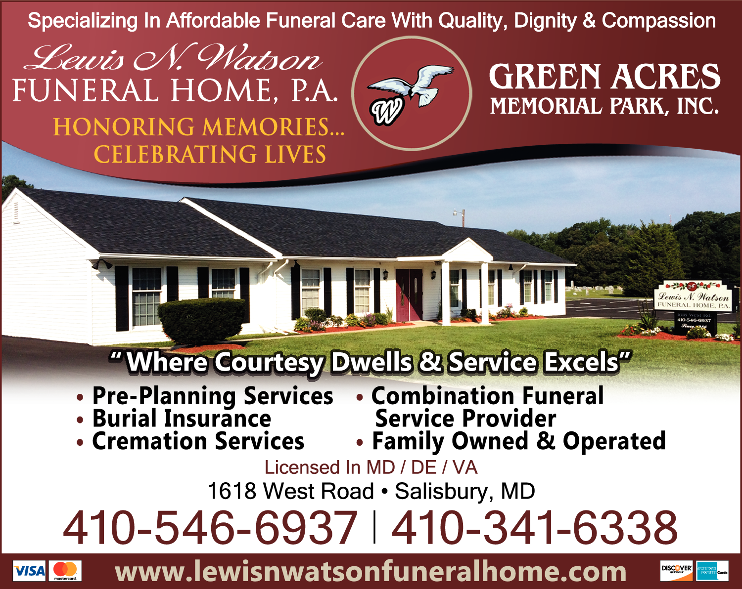 Names and Numbers Verified Cremation Services Funeral Homes Funeral Plans - Pre-Arranged HomesFor over 30 years, Lewis N. Watson Funeral Home, P.A. has served the families of the Eastern Shore of Maryland, Delaware and Virginia with superior service and attention to every detail. We proudly provide to each family personal, courteous and professional care. As a combinat…