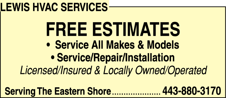 Names and Numbers Verified Air Conditioning Contractors Heating Contractors Home Improvement Services HVAC CONTRACTORSLewis HVAC Services is a locally owned and operated business that provides reliable and professional HVAC services in the Eastern Shore area. With a focus on customer satisfaction, we offer same-day service and 24/7 emergency service to ensure that our clients' heating and cooli…