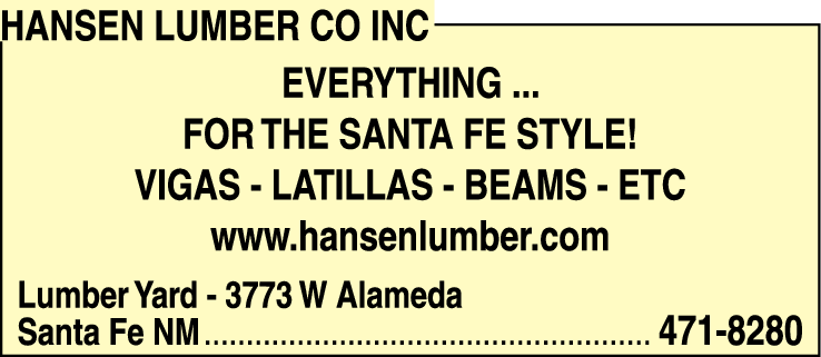 Names and Numbers Verified Building Materials Firewood Lumber - Retail Lumber - WholesaleHansen Lumber has been serving our customers in the northern New Mexico area since 1927. We are a family-owned and operated business that prides itself on the products we produce. We have the many years of experience needed to capture the Santa Fe Style look in the project you a…
