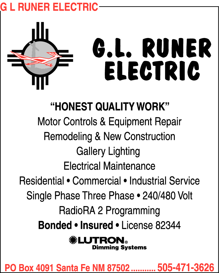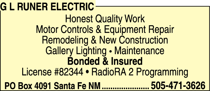 Names and Numbers Verified Electrician Electric Equipment - Service & Repair Lighting Consultants & Designers RemodelingGL Runer Electric is a reputable electrical company based in Santa Fe, NM, specializing in a wide range of electrical services for residential and commercial clients. With a team of experienced electricians, GL Runer Electric focuses on providing quality workmanship and relia…