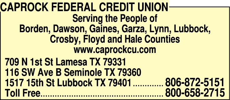 Names and Numbers Verified Banks Credit Unions Financing LoansHere at Caprock Federal Credit Union we try to offer the most efficient and timely financial services available. We offer share savings, share-draft checking, share certificates of deposit, IRA’s, and financing for autos, motorcycles, rv’s, and homes. Call today and we’ll partne…