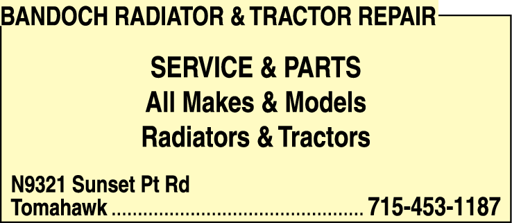 Names and Numbers Verified Radiators - Automotive & Industrial Tractor Repair & Service RadiatorsBANDOCH RADIATOR & TRACTOR REPAIR SERVICE & PARTS is a professional and reliable business located at N9321 Sunset Pt Rd in Tomahawk. With a focus on excellence and customer satisfaction, our dedicated team specializes in repairing and providing parts for all makes and models of …