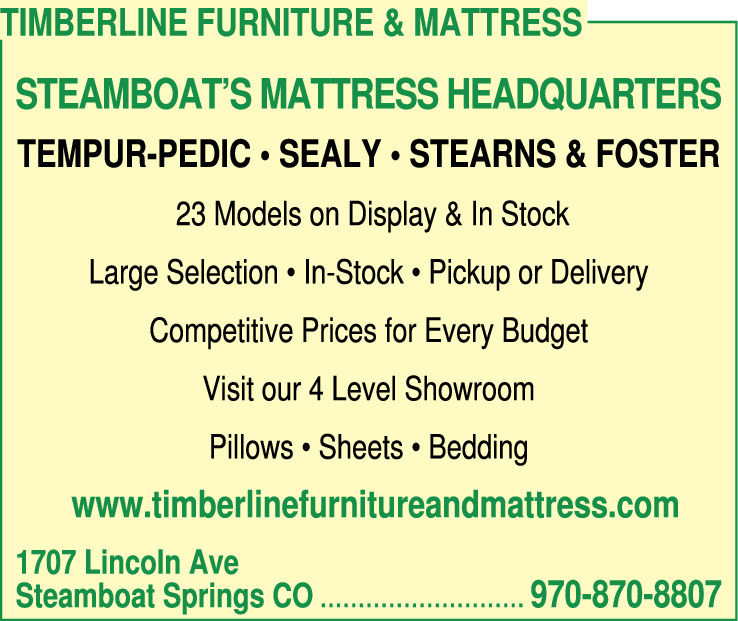 Names and Numbers Verified Bed & Bath Accessories Fabric Shops Furniture Dealers Home FurnishingsTimberline Furniture and Mattress is a family owned Furniture, Mattress store located in Steamboat Springs, CO. We offer the best in home Furniture, Mattress at discount prices.