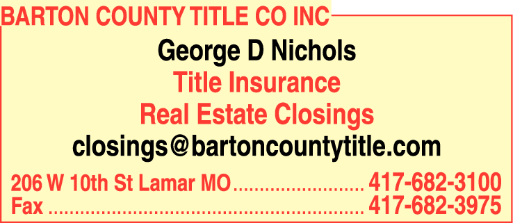 Names and Numbers Verified Title CompaniesBarton County Title Co Inc is a prominent business in Lamar, Missouri, dedicated to providing exceptional title services to its clients. With a strong focus on community development and progress, they actively contribute to the growth of Barton County through their involvement i…