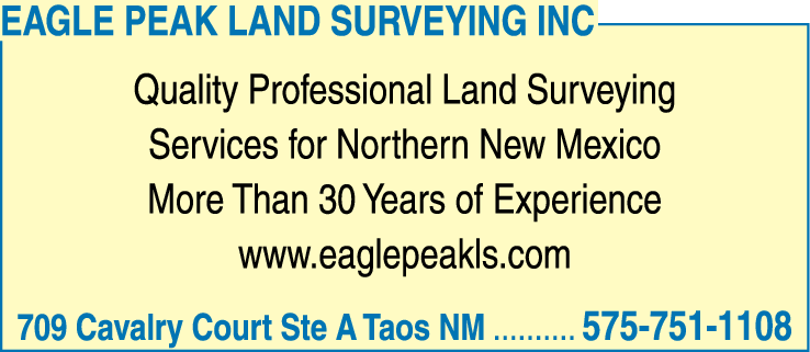 Names and Numbers Verified Land Surveyors SurveyorsEagle Peak Land Surveying Inc is a highly reputable and experienced professional land surveying company located in Taos, New Mexico, serving the entire Northern region of the state. With over 30 years of experience in the field, we specialize in providing exceptional quality lan…