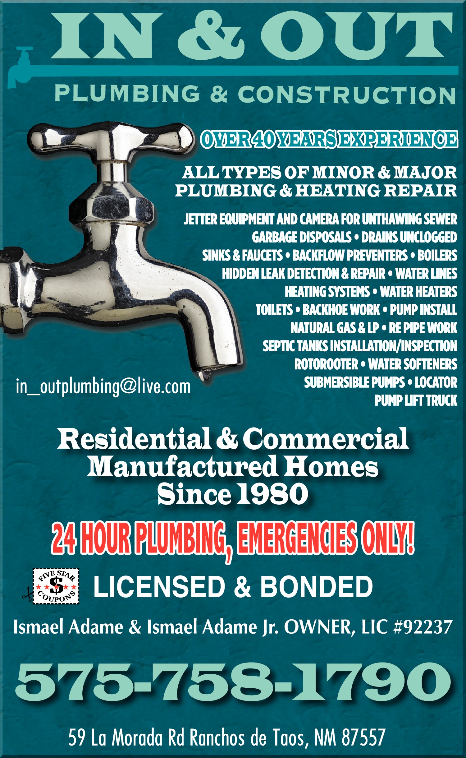 Names and Numbers Verified Excavating Contractors Gas - Natural & Propane - Equipment, Sales, Service & Installation Propane Gas Heating ContractorsIn & Out Plumbing & Construction is a reputable business with over 40 years of experience in the industry. We specialize in septic tank installation, offering top-notch service to our customers. Our highly skilled team also excels in backhoe work, repipe work, water lines, rotor…