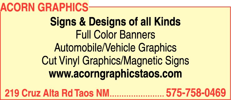 Names and Numbers Verified Banners Magnets & Magnetic Devices Sign shop LabelsAcorn Graphics, located in Taos New Mexico has been part of the community since 1984. Our mission has been to provide signage and graphic products of the highest quality at the best price possible. We are proud of the part we have played in the design and production of image mak…