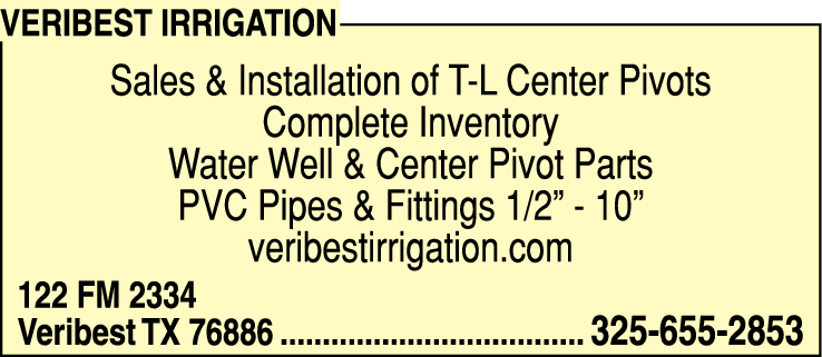 Names and Numbers Verified Irrigation Systems & Equipment PumpsKeep your crops watered with a T-L™ center pivot irrigation system from Veribest Irrigation in Texas. For more than 12 years we have specialized in sales and installations for T-L™ center pivot systems, underground pipelines, and electrical upgrades. We also have an extensive in…