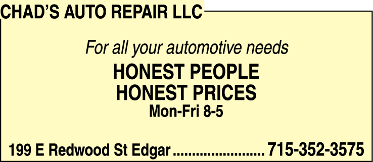 Names and Numbers Verified Auto Repair & ServiceChad's Auto Repair LLC is a trusted and reliable automotive service provider located at 199 E Redwood St in Edgar. We are dedicated to meeting all your automotive needs with our team of experienced and skillful technicians. At Chad's Auto Repair LLC, honesty is our priority, and…