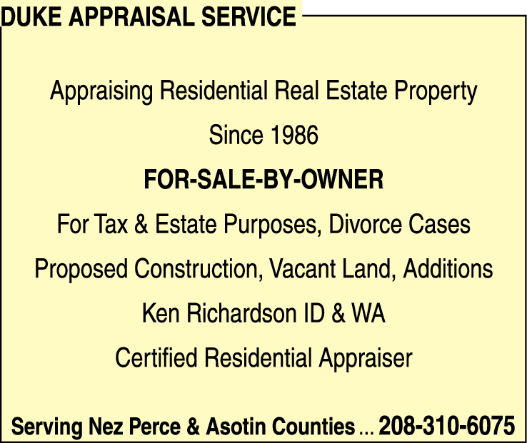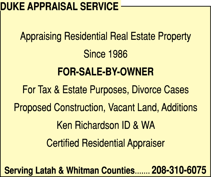 Names and Numbers Verified Appraisers Real Estate AppraisersNeed an appraisal?; Ken Richardson, sole proprietor of Duke Appraisal Service has been appraising residential real estate for over 30 years in Latah & Nez Perce, Idaho, and Whitman & Asotin, Washington. His experience, coupled with long-term relationships with local realtors an…