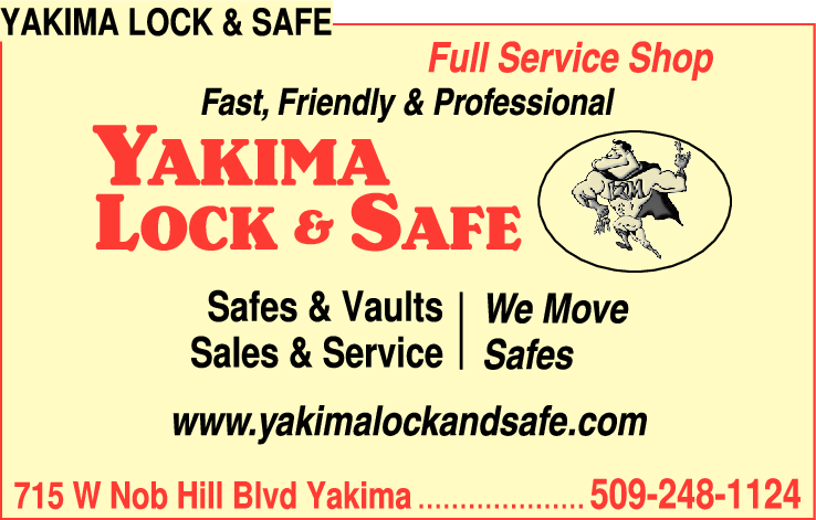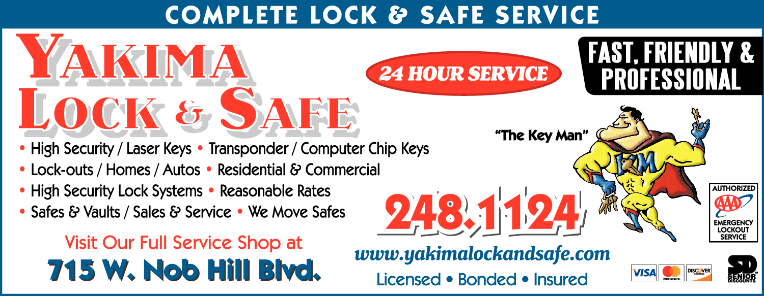 Names and Numbers Verified Keys Locksmiths Road Service - Automotive Safes & VaultsYakima Lock & Safe is your Residential, Commercial & Auto Locksmith Specialist! Yakima Lock & Safe has been in business in Yakima for over twenty years. We have been providing locksmith services to the Yakima area for over 30 years. The owner knows what he's doing and has the …