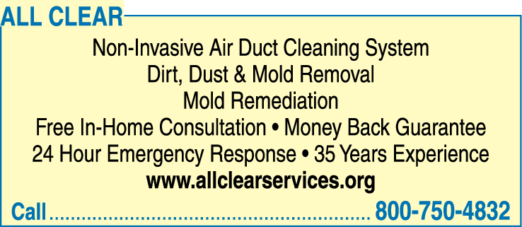 Names and Numbers Verified Air Duct Cleaning Carpet Cleaners Duct Cleaning Services Fire & Water Damage RestorationSoutheastern Kansas' Premier Cleaning and Restoration Company Whether you need emergency service or periodic cleaning, you can rest assured that the level of service you receive from All Clear will meet or exceed your expectations. Formerly Steam Way Restorations, All Clear ha…