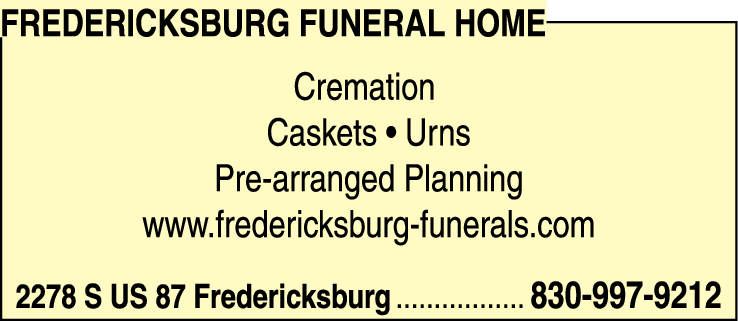 Names and Numbers Verified Cremation Services Funeral Homes Funeral Plans - Pre-Arranged HomesFredericksburg Funeral Home is a well-established funeral service provider located at 2278 S US 87 in Fredericksburg. With our compassionate and experienced team, we specialize in offering a range of services including cremation, caskets, urns, and pre-arranged planning. At F…