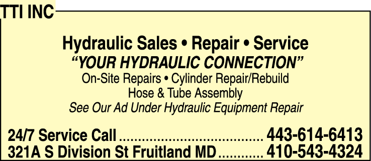 Names and Numbers Verified Hydraulic Equipment Repair Hydraulic Equipment & Supplies Lubricants Lubricating OilsTTI INC Hydraulic Sales Repair Service is a leading provider of hydraulic sales, repair, and service in Fruitland, MD. With the slogan "YOUR HYDRAULIC CONNECTION," we offer a wide range of services to meet the needs of our customers. Our team of experienced technicians specia…
