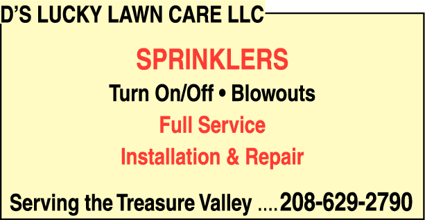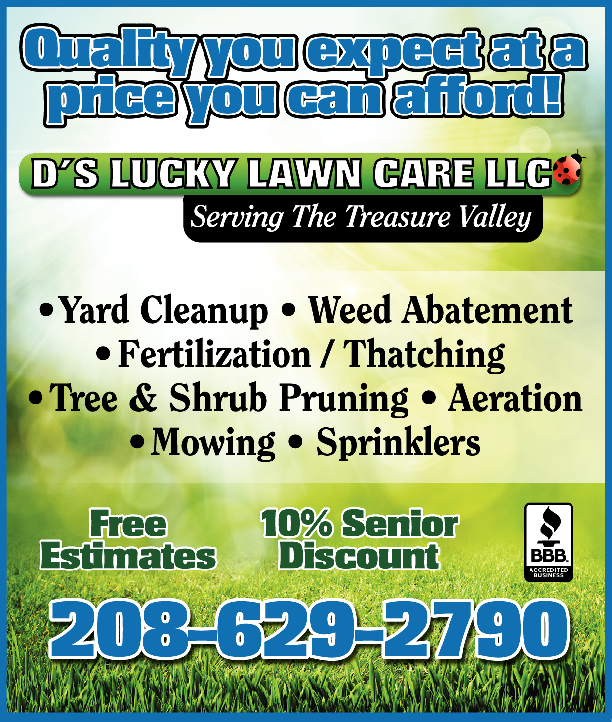Names and Numbers Verified Landscapers Lawn Care & Maintenance Pest Control Services Sprinklers - Garden & LawnD's Lucky Lawn Care LLC is your place for impressive lawn maintenance, sprinkler systems, tree and shrub work, and more. Sign up for a weekly lawn maintenance plan or a spring and fall cleanup. Benefit from over a quarter-century of experience. Seniors receive a 10% discount. Co…