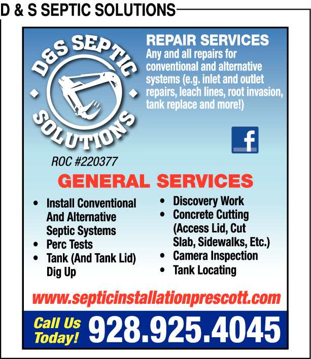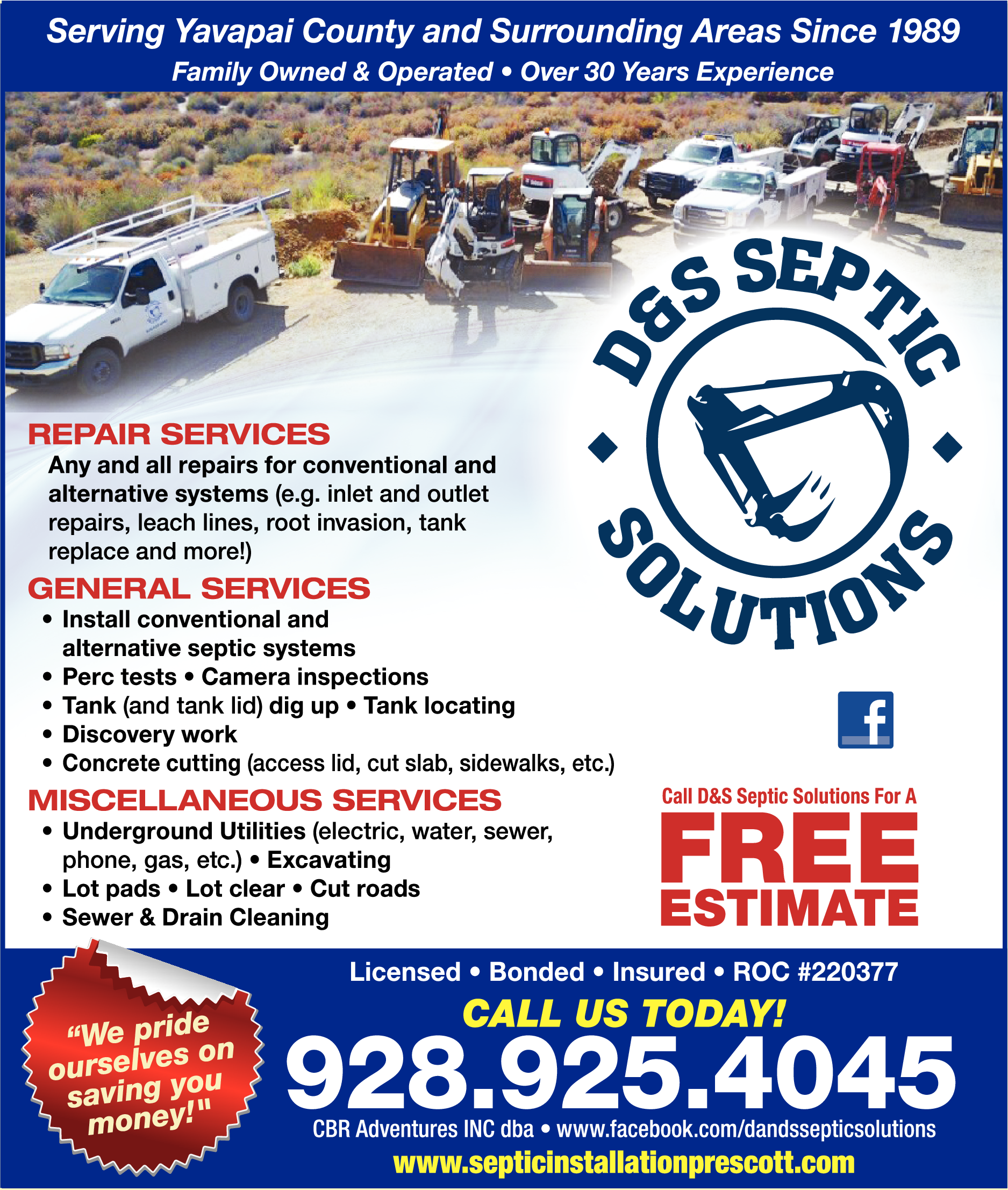 Names and Numbers Verified Plumbers Drain & Sewer Cleaning Septic Tanks & Systems - Cleaning, Inspection, Removal & Repair Excavating ContractorsD&S Septic Solutions is a family-owned and operated business that has been serving Yavapai County and surrounding areas since 1989. With over 30 years of experience in the real estate septic industry, we specialize in providing top-notch septic repair services for both conventio…