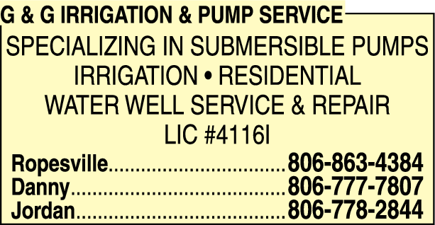 Names and Numbers Verified Pumps Pumps - Dealers, Repair & Service Pumps - Water - Sales & Service Water Well Pump Sales & ServiceG & G Irrigation & Pump Service is a reputable and reliable business that specializes in submersible pumps and water well service & repair. With a dedicated team of professionals, we guarantee top-notch service in Ropesville and the surrounding areas. Our expertise lies in irrig…