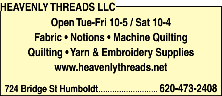 Names and Numbers Verified Fabric Shops Therapeutic Massage Quilting Quilting Materials & SuppliesHEAVENLY THREADS LLC is a specialized business offering a wide range of products and services to quilting, yarn, and embroidery enthusiasts. Located at 724 Bridge St in Humboldt, our store is open Monday to Friday from 10 am to 5 pm, and on Saturdays from 10 am to 4 pm. Custo…